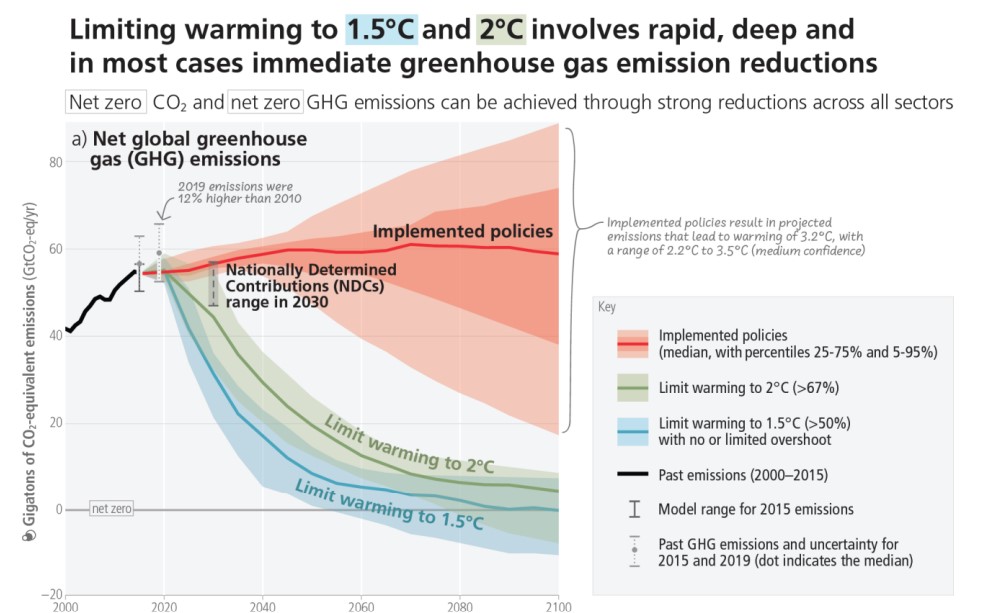 All global modelled pathways that limit warming to 1.5°C with no or limited overshoot, and those that limit warming to 2°C, involve rapid and deep and, in most cases, immediate greenhouse gas emissions reductions in all sectors this decade. Global net zero CO2 emissions are reached for these pathway categories, in the early 2050s and around the early 2070s, respectively.
