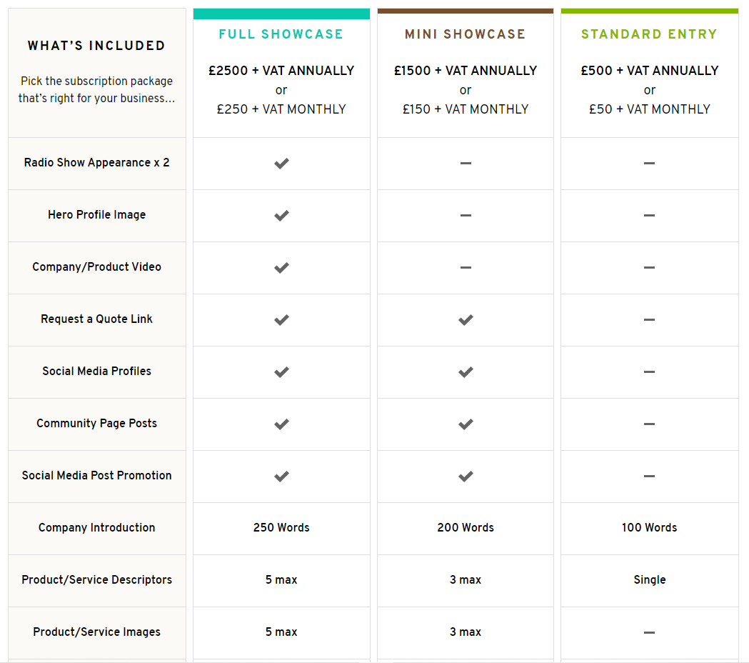Our Mini Showcase offers businesses a more condensed profile, but still with many of the same overall benefits. Company introduction (minus video & hero image) and individual product/services features (up to max 3) with supporting images are a given, as is access to our Community page for you to post your latest news and promotional call to action/content for us to promote through social media. Whilst we won’t be able to invite you onto our radio show, you’ll still benefit from an ongoing push from our side to ensure your business gets noticed and generates those all important new enquiries.